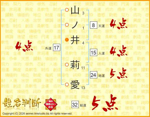 山(3画)ノ(1画)井(4画) 莉(11画)愛(13画)