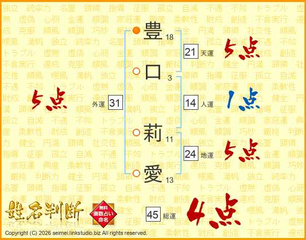 豊(18画)口(3画) 莉(11画)愛(13画)