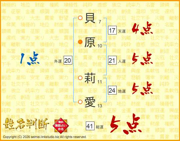 貝原莉愛さんの総運は41画の5点!