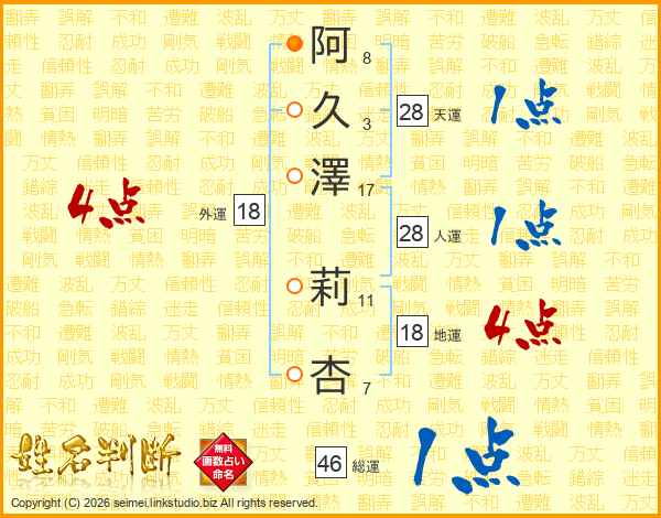 阿(8画)久(3画)澤(17画) 莉(11画)杏(7画)
