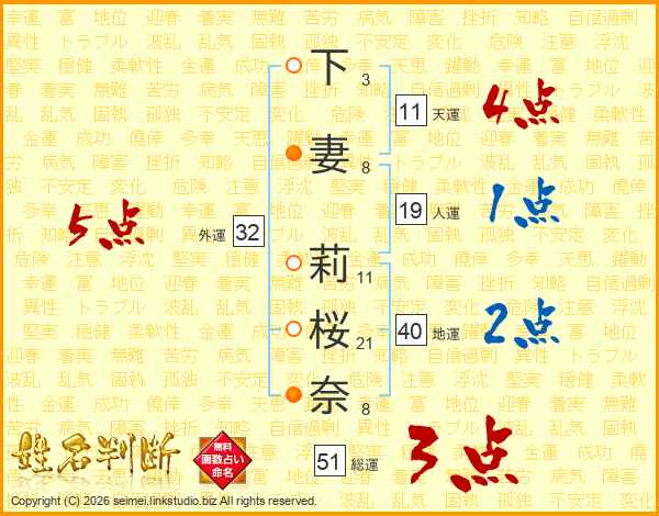 下妻莉桜奈さんの外運は32画の5点!