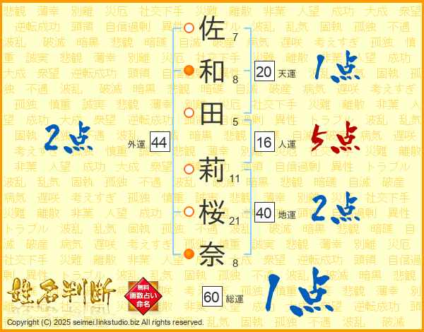 佐和田莉桜奈さんの外運は44画の2点!