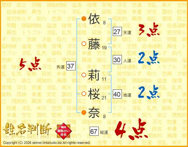 依(8画)藤(19画) 莉(11画)桜(21画)奈(8画)
