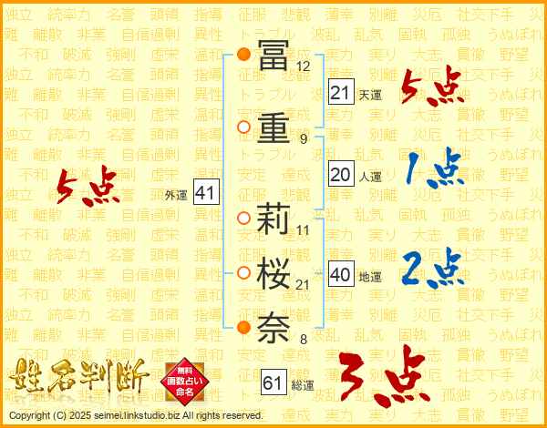 冨(12画)重(9画) 莉(11画)桜(21画)奈(8画)