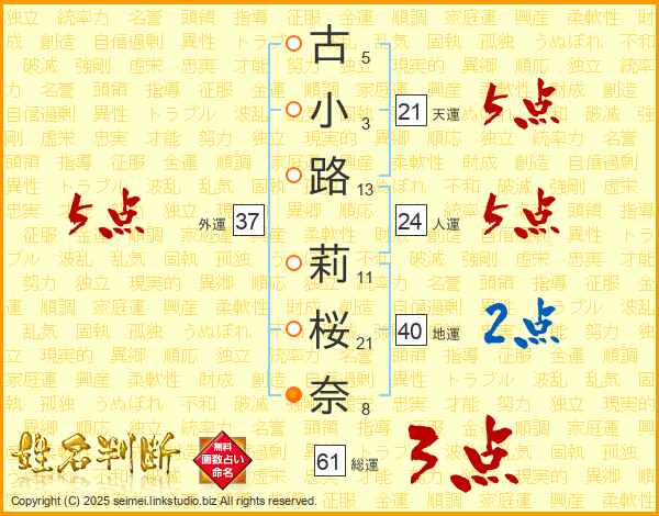 古(5画)小(3画)路(13画) 莉(11画)桜(21画)奈(8画)