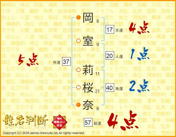 岡(8画)室(9画) 莉(11画)桜(21画)奈(8画)