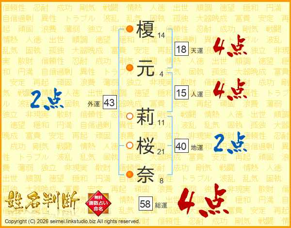榎元莉桜奈さんの総運は58画の4点!