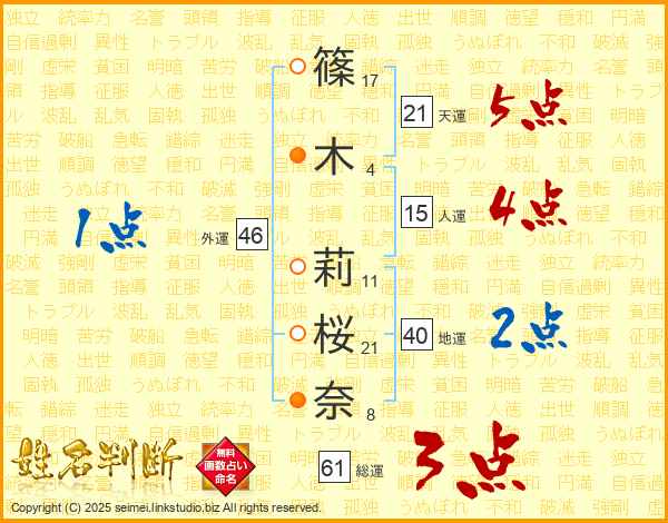 篠(17画)木(4画) 莉(11画)桜(21画)奈(8画)