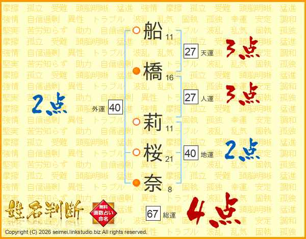 船(11画)橋(16画) 莉(11画)桜(21画)奈(8画)