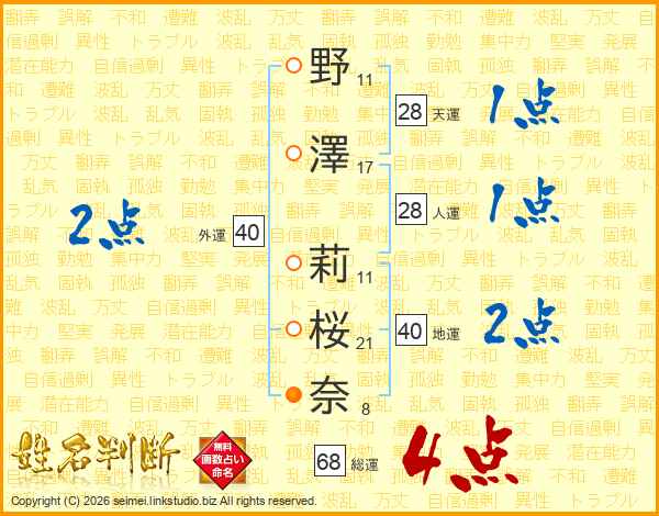 野澤莉桜奈さんの総運は68画の4点!