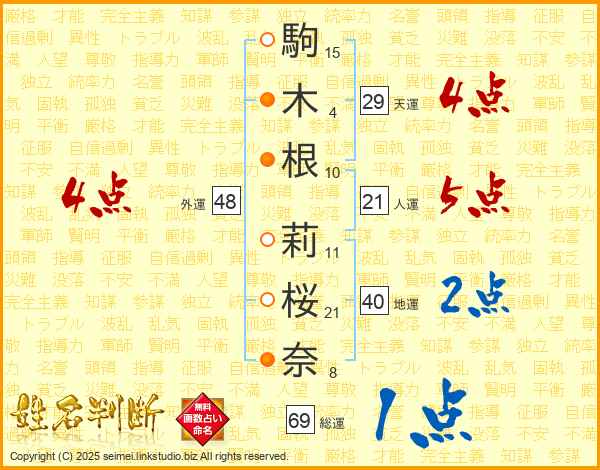 駒(15画)木(4画)根(10画) 莉(11画)桜(21画)奈(8画)