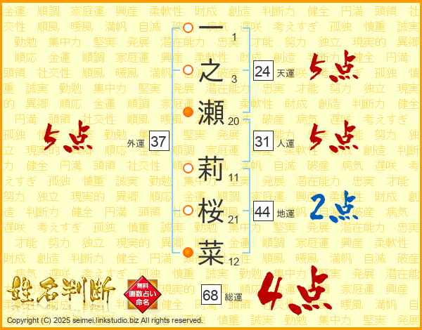 一(1画)之(3画)瀬(20画) 莉(11画)桜(21画)菜(12画)