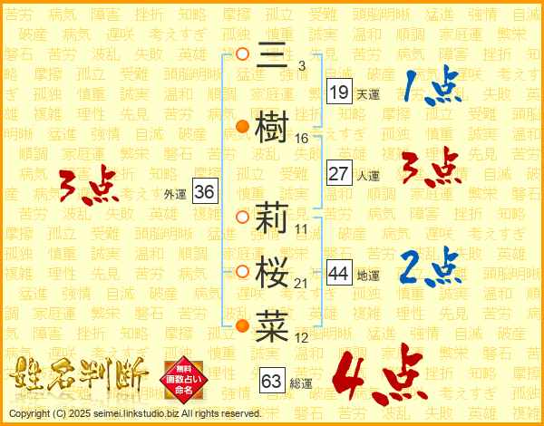 三(3画)樹(16画) 莉(11画)桜(21画)菜(12画)