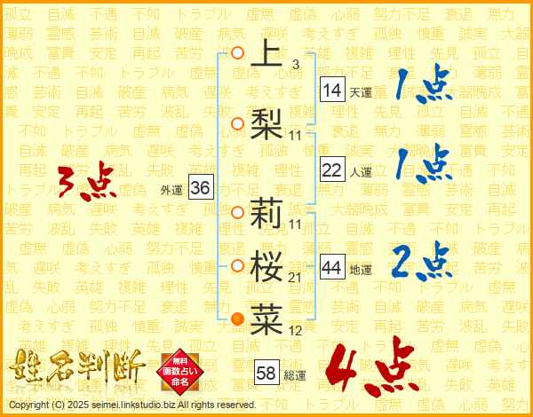 上梨莉桜菜さんの総運は58画の4点!