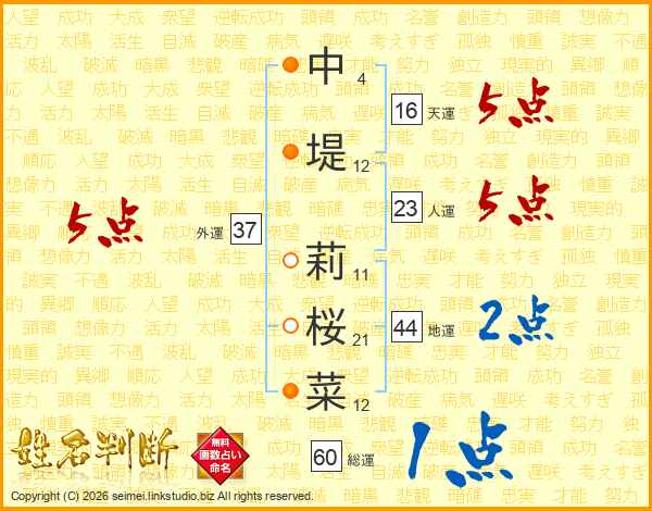 中(4画)堤(12画) 莉(11画)桜(21画)菜(12画)