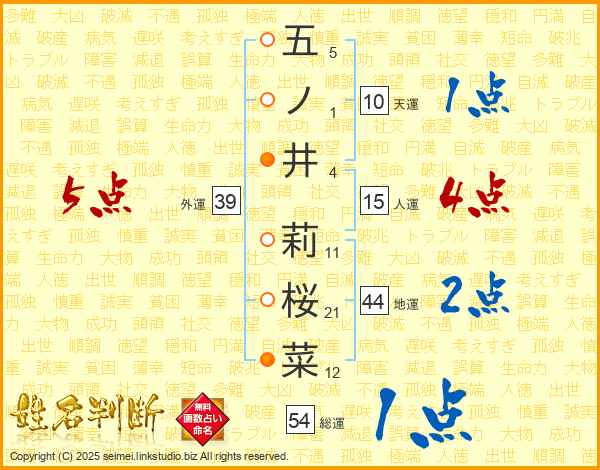 五(5画)ノ(1画)井(4画) 莉(11画)桜(21画)菜(12画)
