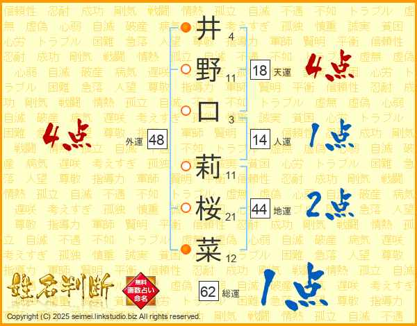 井(4画)野(11画)口(3画) 莉(11画)桜(21画)菜(12画)