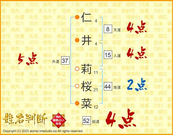 仁井莉桜菜さんの総運は52画の4点!