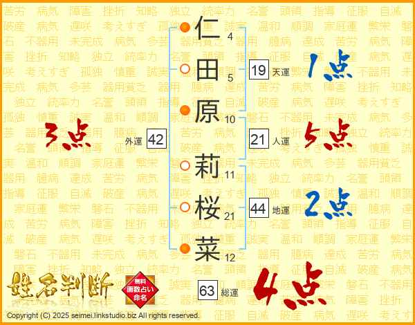 仁(4画)田(5画)原(10画) 莉(11画)桜(21画)菜(12画)