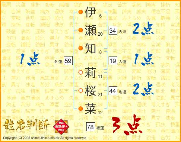 伊(6画)瀬(20画)知(8画) 莉(11画)桜(21画)菜(12画)
