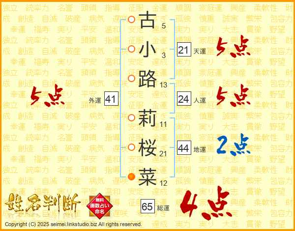 古(5画)小(3画)路(13画) 莉(11画)桜(21画)菜(12画)