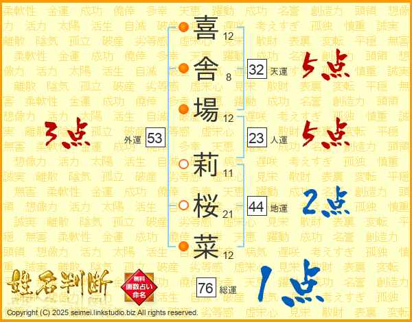 喜(12画)舎(8画)場(12画) 莉(11画)桜(21画)菜(12画)