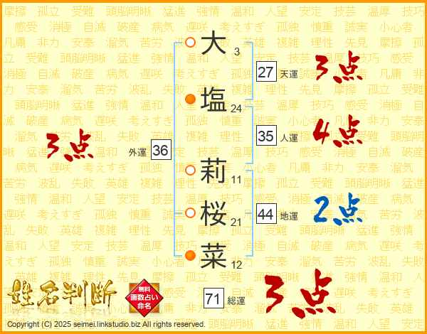 大(3画)塩(24画) 莉(11画)桜(21画)菜(12画)