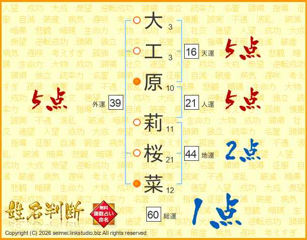 大(3画)工(3画)原(10画) 莉(11画)桜(21画)菜(12画)