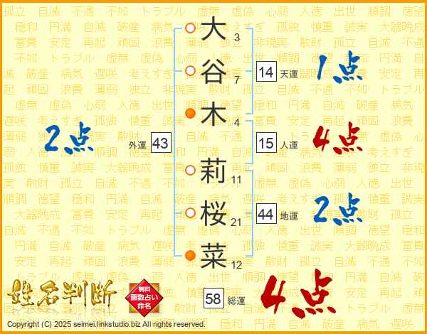 大(3画)谷(7画)木(4画) 莉(11画)桜(21画)菜(12画)