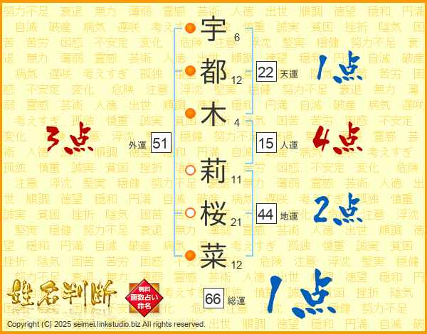 宇(6画)都(12画)木(4画) 莉(11画)桜(21画)菜(12画)