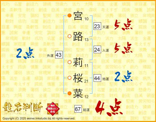 宮(10画)路(13画) 莉(11画)桜(21画)菜(12画)