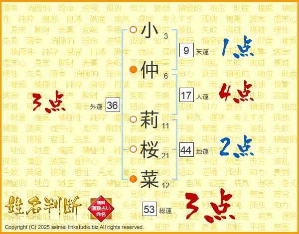小(3画)仲(6画) 莉(11画)桜(21画)菜(12画)