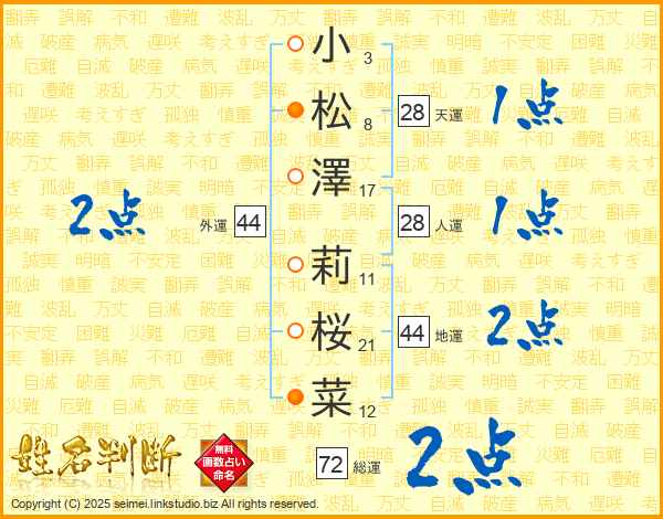 小(3画)松(8画)澤(17画) 莉(11画)桜(21画)菜(12画)