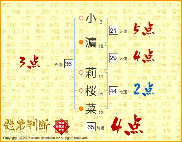 小(3画)濵(18画) 莉(11画)桜(21画)菜(12画)