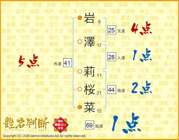 岩(8画)澤(17画) 莉(11画)桜(21画)菜(12画)