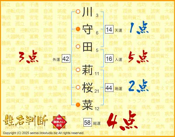 川(3画)守(6画)田(5画) 莉(11画)桜(21画)菜(12画)