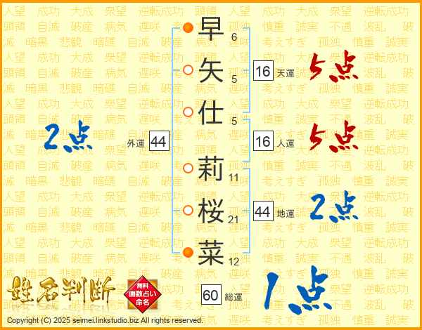早(6画)矢(5画)仕(5画) 莉(11画)桜(21画)菜(12画)