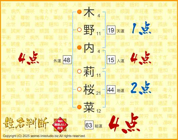木(4画)野(11画)内(4画) 莉(11画)桜(21画)菜(12画)