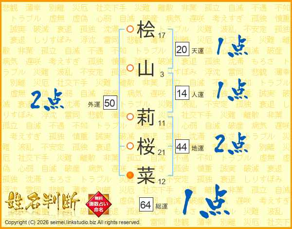 桧(17画)山(3画) 莉(11画)桜(21画)菜(12画)
