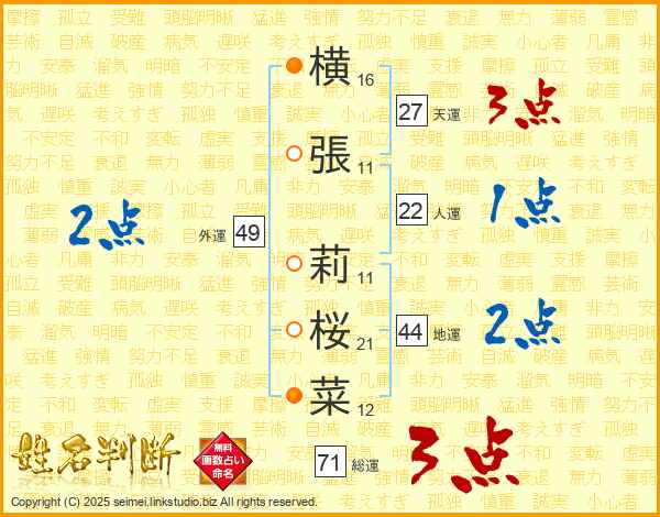 横(16画)張(11画) 莉(11画)桜(21画)菜(12画)