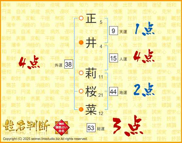 正(5画)井(4画) 莉(11画)桜(21画)菜(12画)