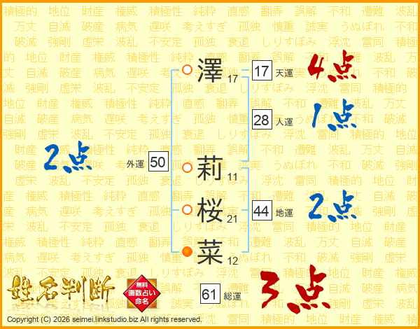 澤(17画) 莉(11画)桜(21画)菜(12画)