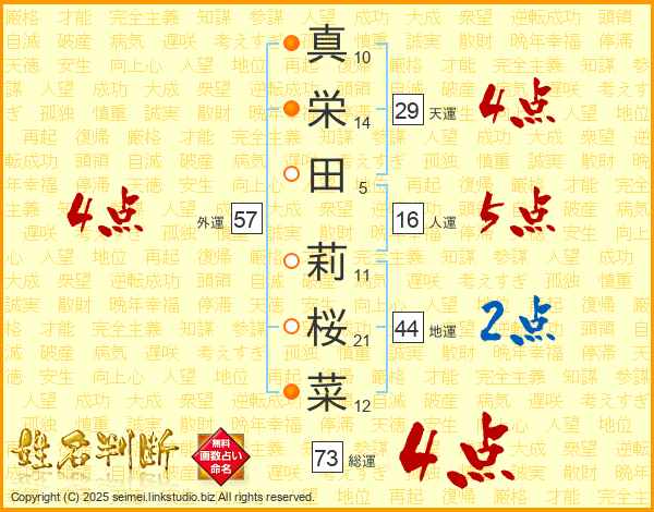 真(10画)栄(14画)田(5画) 莉(11画)桜(21画)菜(12画)