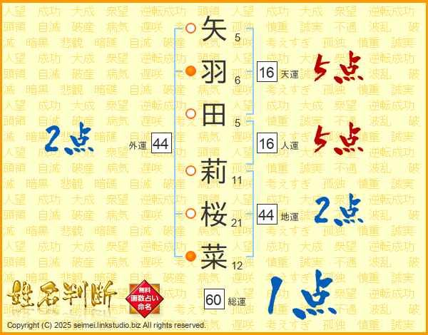 矢(5画)羽(6画)田(5画) 莉(11画)桜(21画)菜(12画)