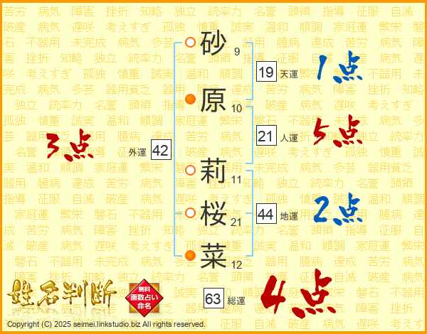 砂(9画)原(10画) 莉(11画)桜(21画)菜(12画)