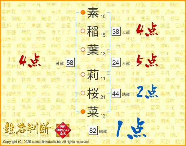 素(10画)稲(15画)葉(13画) 莉(11画)桜(21画)菜(12画)