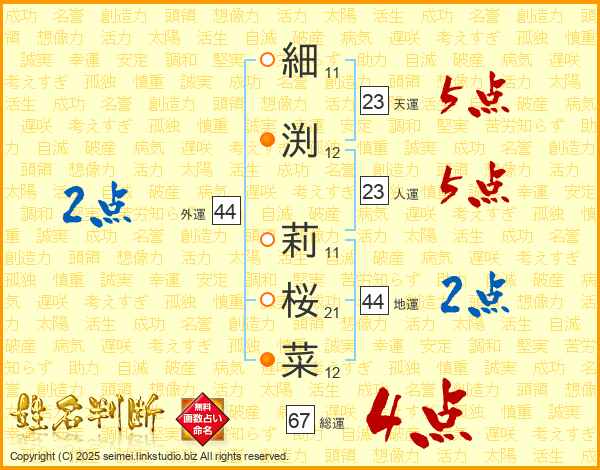 細(11画)渕(12画) 莉(11画)桜(21画)菜(12画)