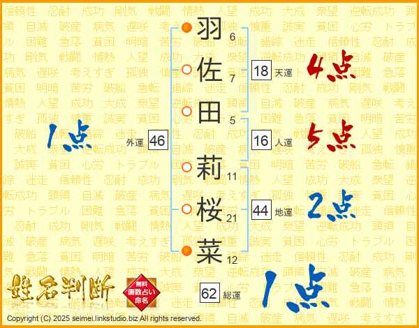 羽(6画)佐(7画)田(5画) 莉(11画)桜(21画)菜(12画)