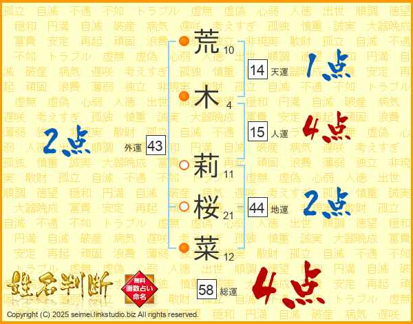 荒(10画)木(4画) 莉(11画)桜(21画)菜(12画)