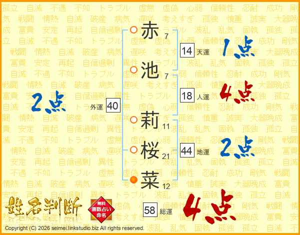 赤池莉桜菜さんの総運は58画の4点!
